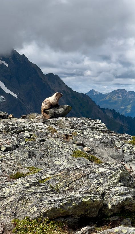 The Sahale Arm trail is about 3 miles with 2,200 feet of elevation gain that gradually gets steeper and more technical as you approach the summit and campsites. Since the views were so breathtaking you don’t really notice the elevation gain. There were frequent marmot sightings and this is around the time our mountain goat parade began.