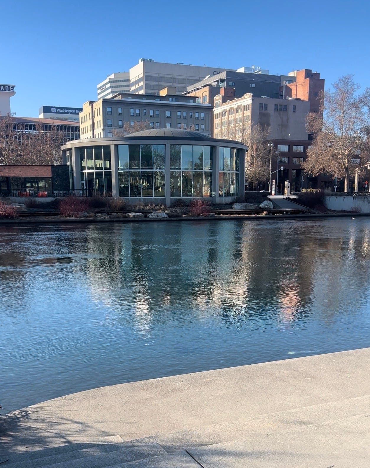 Like any gallery, this one offers places to sit, reflect, and linger. I found myself drawn to the amphitheater-style river steps along the north bank shoreline, directly across from the convention center.