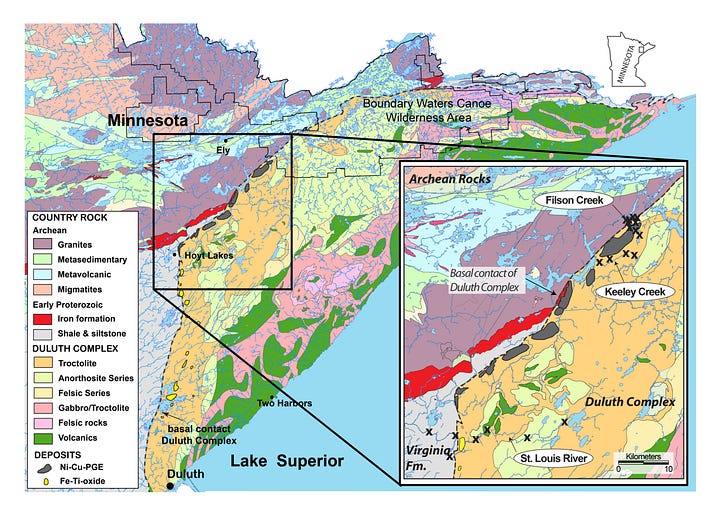 Twin Metals Minnesota, a subsidiary of Antofagasta, a Chilean mining conglomerate, is proposing to extract copper, nickel, and platinum—minerals considered critical to the energy transition and national security. The Duluth Complex in northeastern Minnesota contains these critical minerals which are highly sought after—95% of the country's known nickel resources, 88% of cobalt, 75% of platinum group metals, and a third of copper. Twin Metals is proposing to use dry stacking instead of traditional wet tailings ponds, which reduces the risk of dam failures, and claims that because of the geology and project design, they have eliminated the risk for acid rock drainage. The mine would be an underground mine rather than open pit.