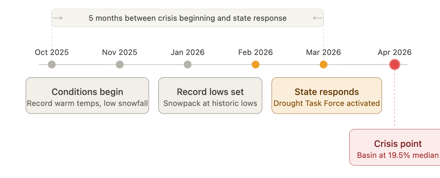In March 2026, Governor Polis activated Colorado’s Drought Task Force through the Department of Natural Resources — a state-level body that brings agencies together to share data and coordinate responses. It sounds like a reasonable system. The problem is that record warm temperatures and below-normal precipitation had been driving snowpack to record lows since October 2025. The state was responding to a crisis that had been building for five months.
