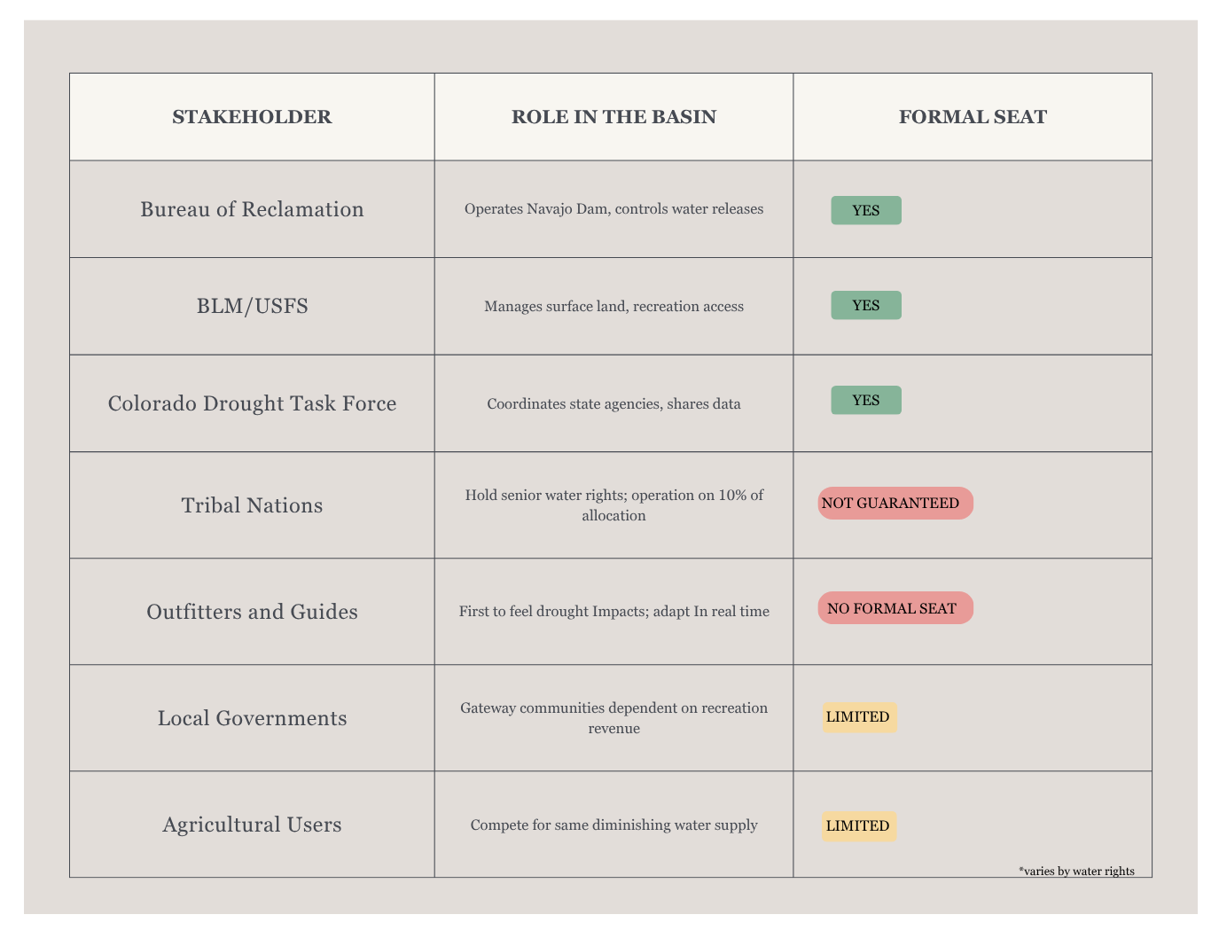 Outfitters and small recreation businesses — the people with the most real-time knowledge of how drought is affecting visitor experience — often have no formal seat at the planning table. The same is true for tribal nations with legally recognized water rights in the basin.