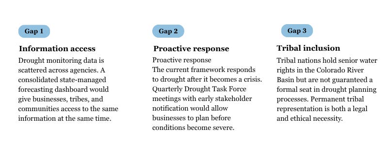 Three gaps stand out as most urgent. The first is the information gap. A consolidated drought forecasting dashboard managed at the state level with input from recreation businesses, tribal nations, and local governments. It would give decision-makers and affected communities access to the same information at the same time. Right now that doesn’t exist in any meaningful way.