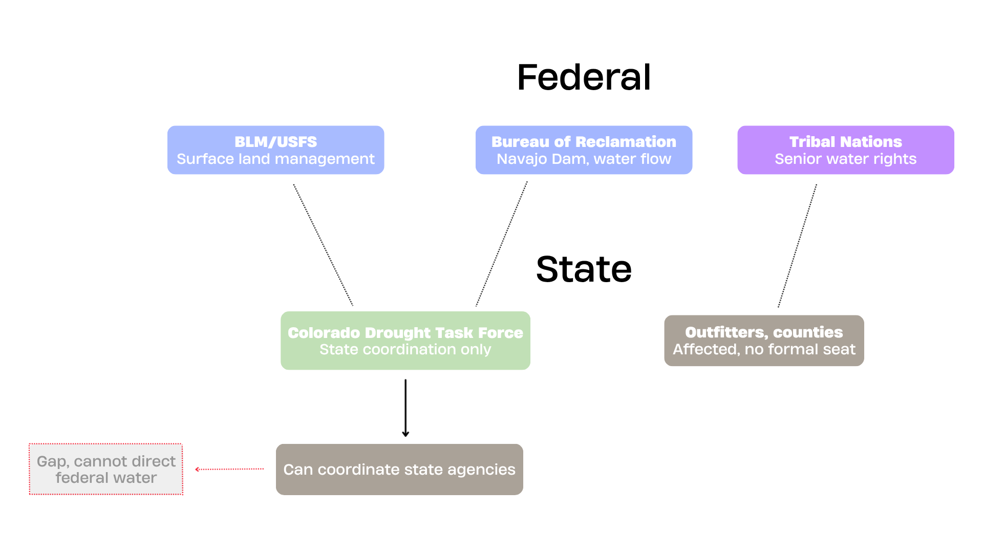 At the federal level, agencies like the U.S. Forest Service and BLM manage the public lands of the San Juan Mountains, while the Bureau of Reclamation operates the infrastructure — including Navajo Dam — that controls how water moves through the system. These agencies operate under different mandates, on different timelines, with different chains of command. The Colorado Drought Task Force can coordinate state agencies, but it cannot direct federal water management decisions. That gap between the body that coordinates and the body that actually controls the water is where drought response most often breaks down.