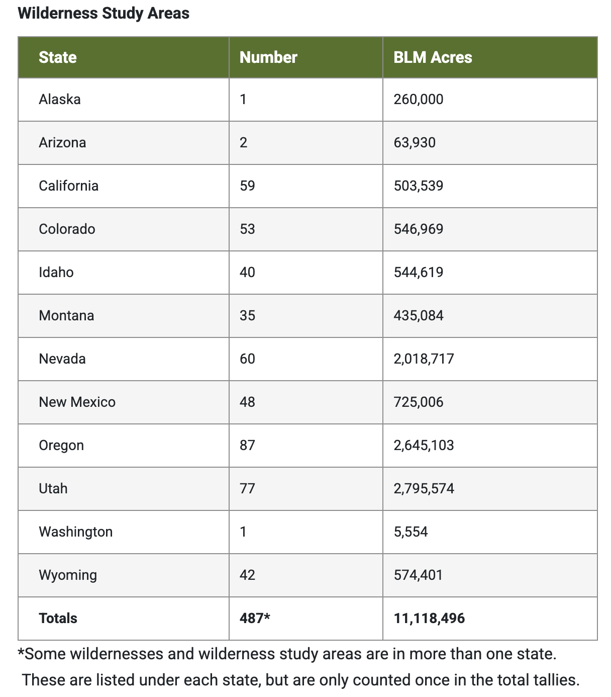 Wilderness Study Areas (WSAs)— areas identified as potentially qualifying for wilderness designation, managed protectively until Congress makes a final determination. There are currently 487 WSAs totaling over 11 million acres.